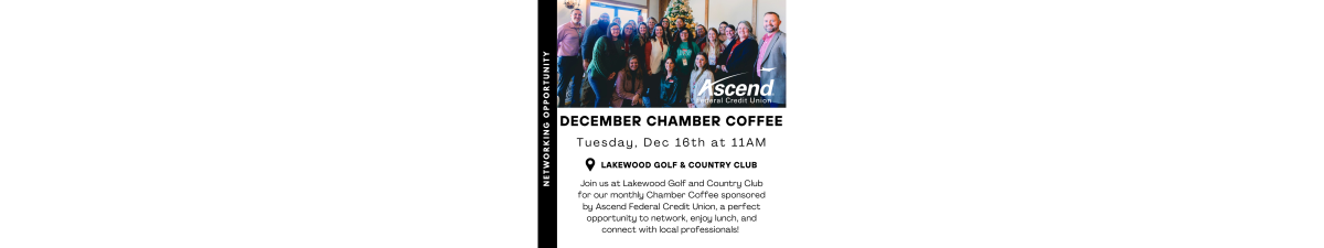 December Chamber Coffee sponsored by Ascend Federal Credit Union Join us for the monthly Chamber Coffee at Lakewood Golf and Country Club sponsored by Ascend Federal Credit Union! Enjoy light refreshments and door prizes! Set a Reminder Enter your email address below to receive a reminder message. Email address Select the amount of Days before the event -- Select Days Before Event -- 1 Day 2 Days 3 Days 1 Week Captcha Validation Please complete the Captcha Submit Date and Time Tuesday Dec 16, 2025 11:00 AM - 12:00 PM CST Location 1900 Country Club Drive, Tullahoma, TN 37388 Fees/Admission Free Set a Reminder Enter your email address below to receive a reminder message. Email address Select the amount of Days before the event -- Select Days Before Event -- 1 Day 2 Days 3 Days 1 Week Captcha Validation Please complete the Captcha Submit Share × Print Email Add to Calendar Facebook Twitter LinkedIn Tell a Friend × Select Calendar Type × Google Yahoo iCal (Outlook, Apple, or other)